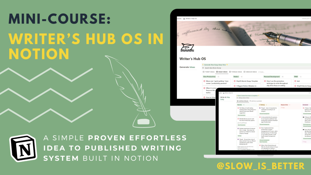 I created the Writer's Hub OS in Notion as my Effortless Idea To Published writing system to help to write consistently and build a sustainable side hustle alongside my 9 to 5.